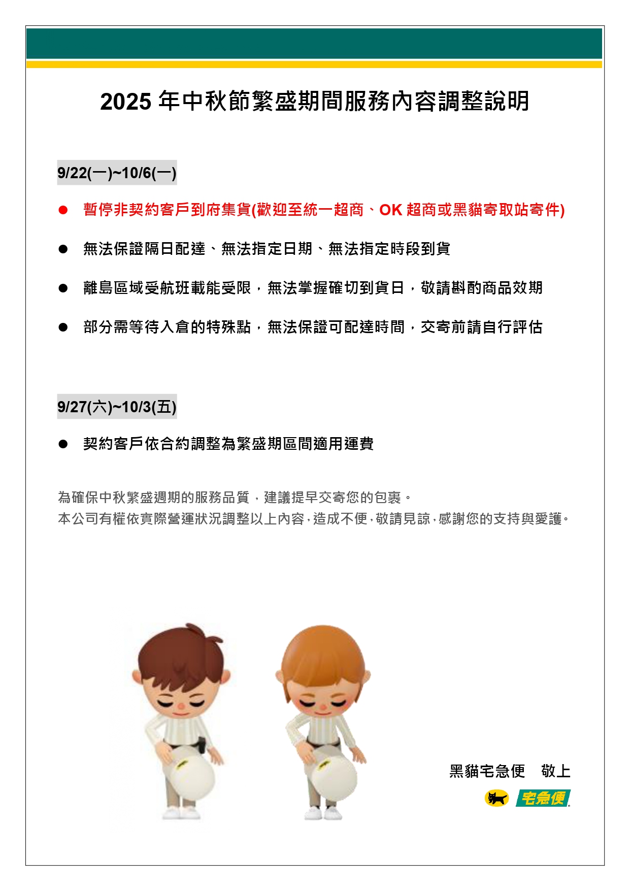 2025中秋節繁盛期間服務內容調整說明黑貓宅配公司將在繁盛期間9/27(六)-10/03(五),暫時調漲運費,運費加收10元。